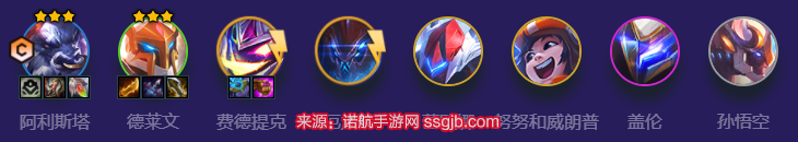 阿利斯塔+德莱文+费德提克+厄加特+蕾欧娜+努努和威朗普+盖伦+孙悟空。